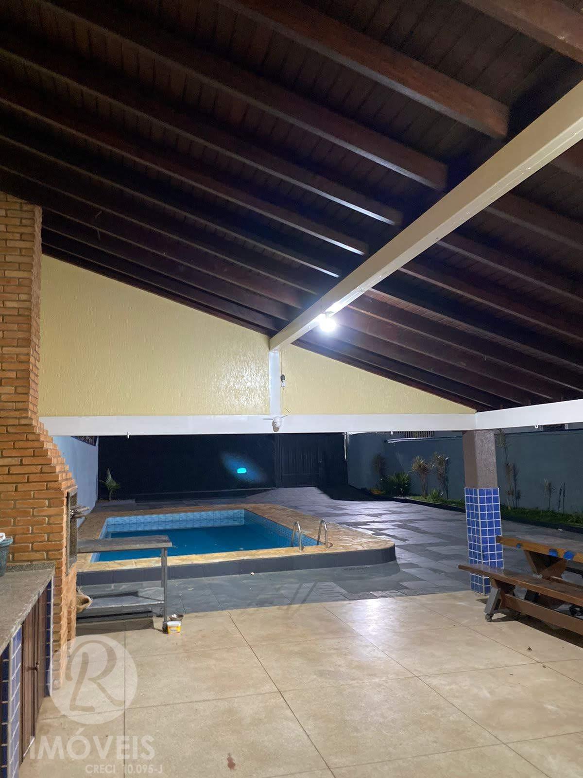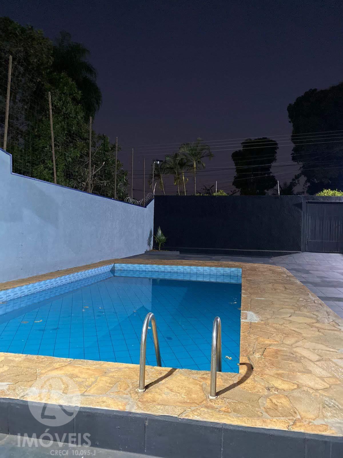 Salão para festa, com capacidade para mais de 150 pessoas, contando com alguns detalhes: Área gourmet coberta, churrasqueira com revestimento de tijolinho e bancadas de granito Piscina 4x8 Jardim Wi-fi Câmeras de monitoramento